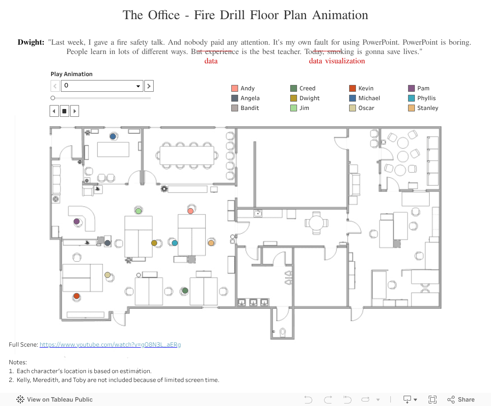 The visual below shows the distance traveled for each person. It is interesting to see who moved the most under intense pressure. For the three calculations below: "Time Elapsed" started when Dwight lit the trash can on fire, "Cost of Damages" are the estimated cost for new projector, window repair, new ceiling tiles, new vending machine, new copier, CPR class, and CPR dummy. The costs excludes Stanley's medical bill. The one serious injury was Stanley's heart attack.